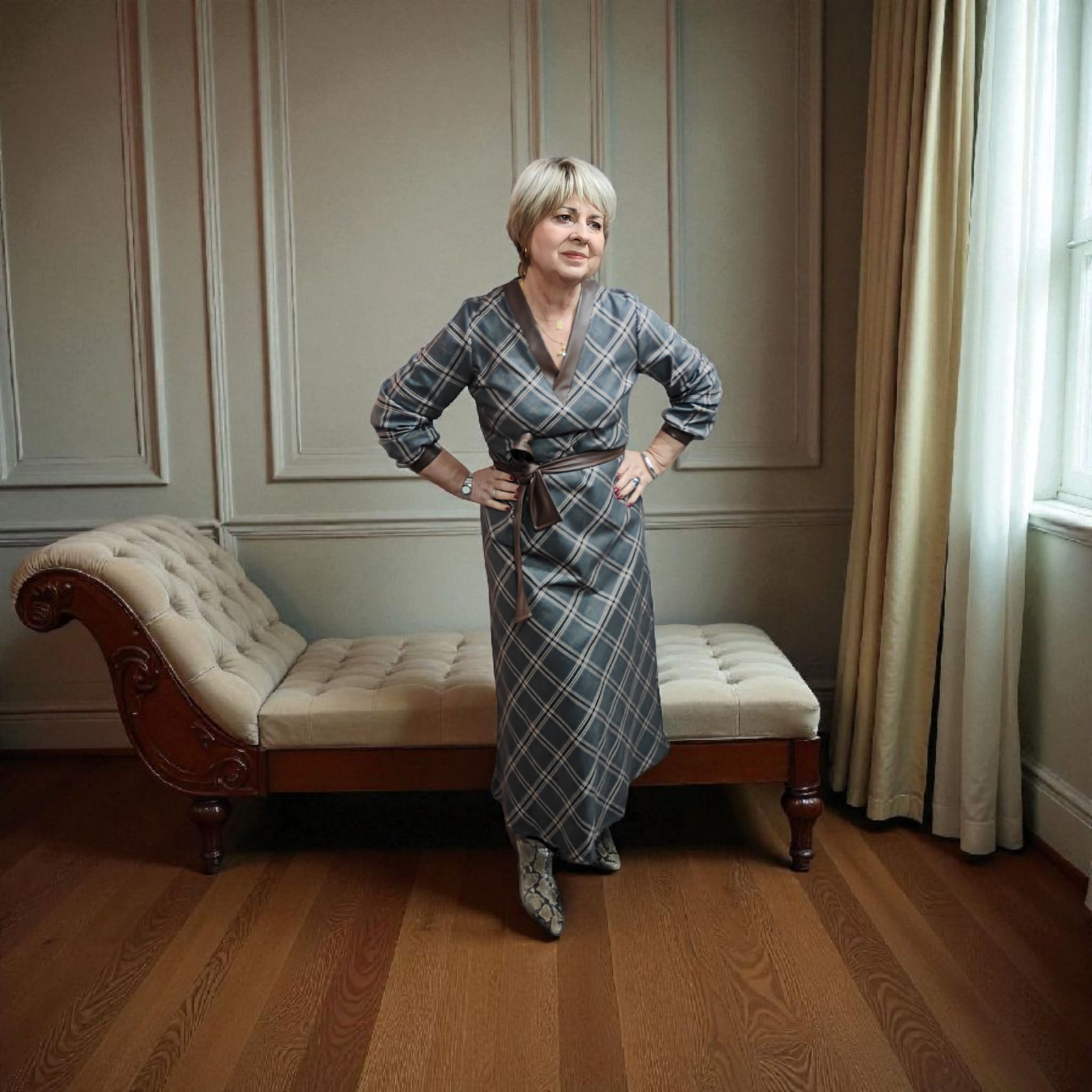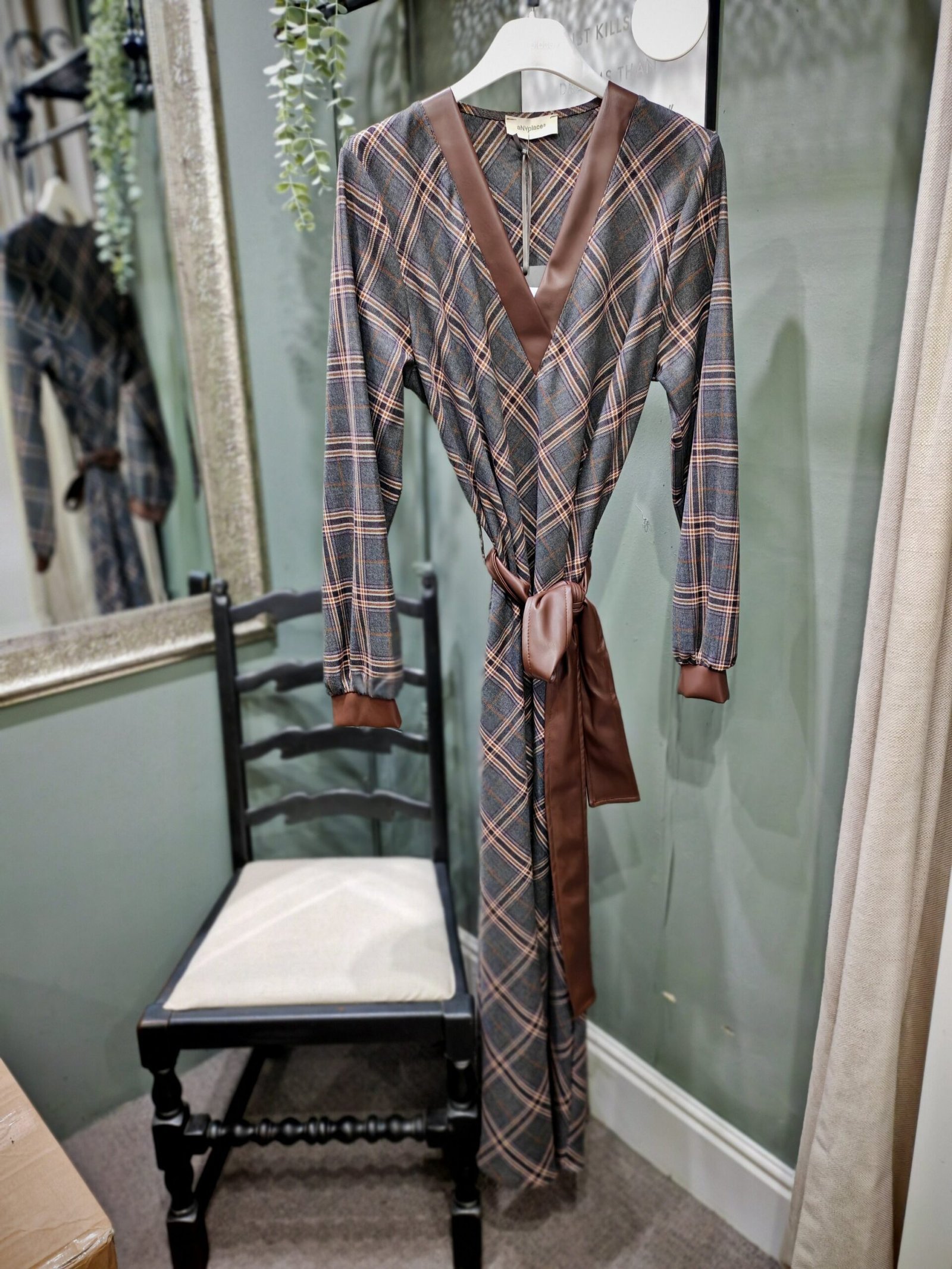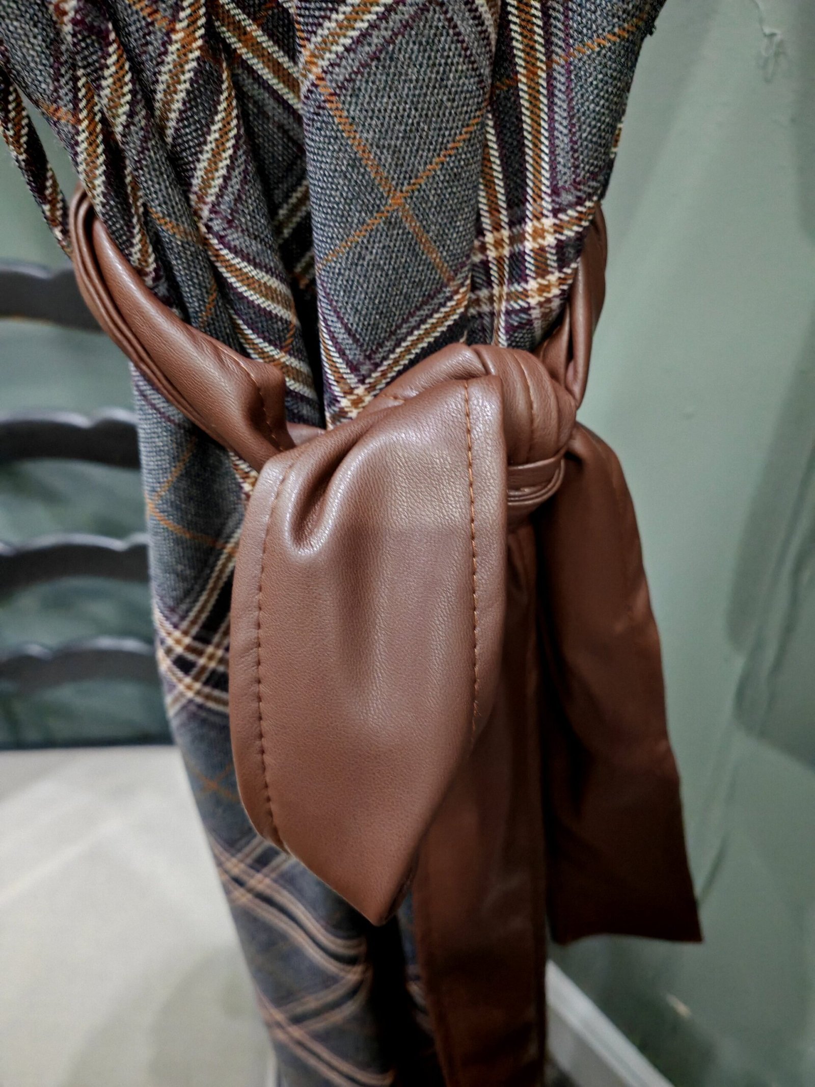 Make a statement in this plaid maxi dress in brown and grey tones, with the added wow of faux leather neck, cuffs and belt.
