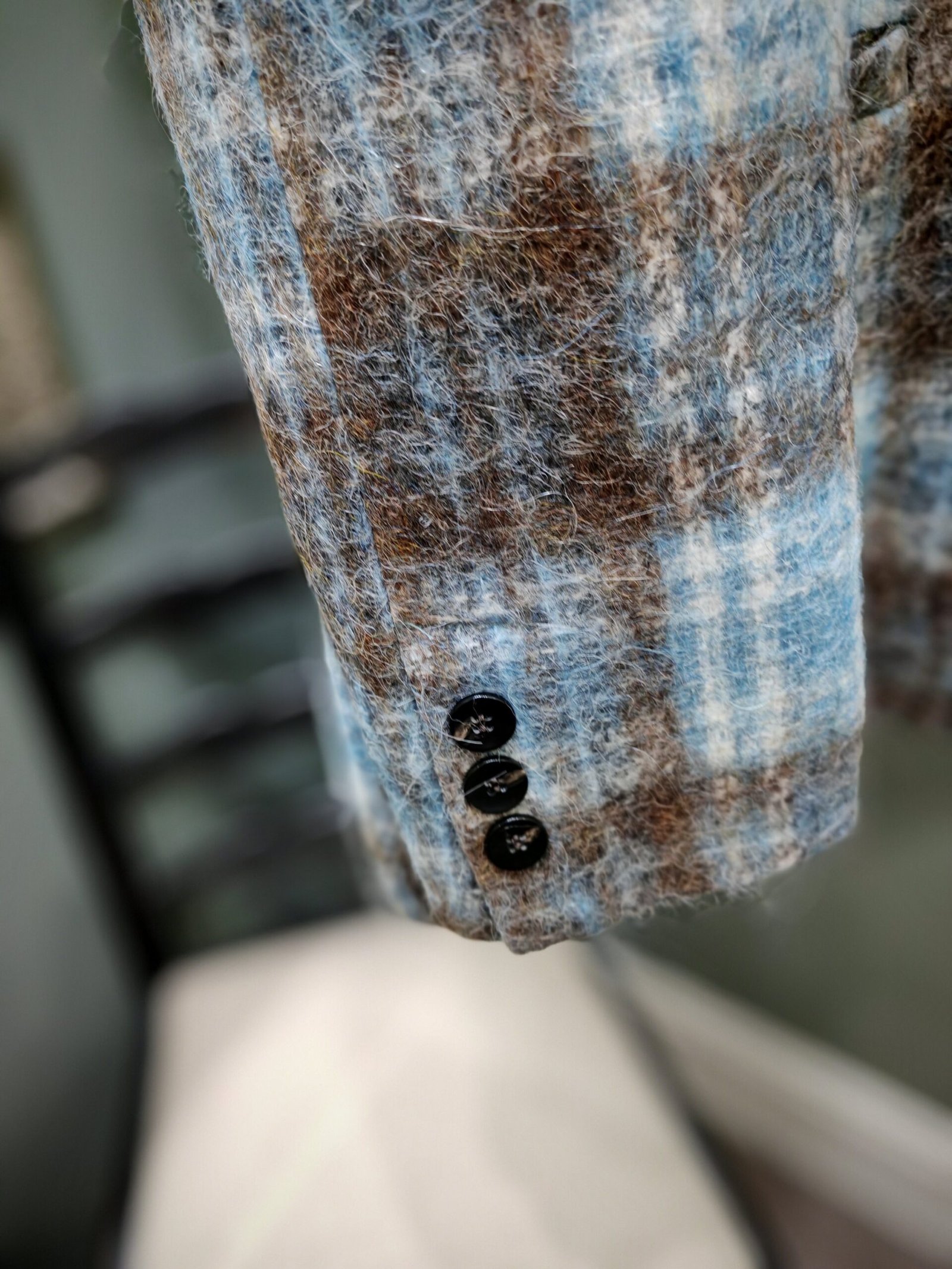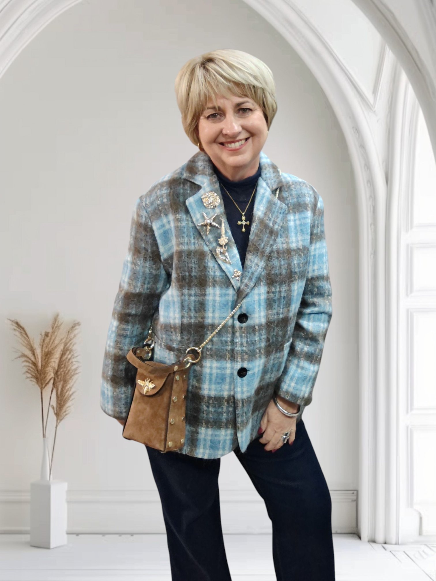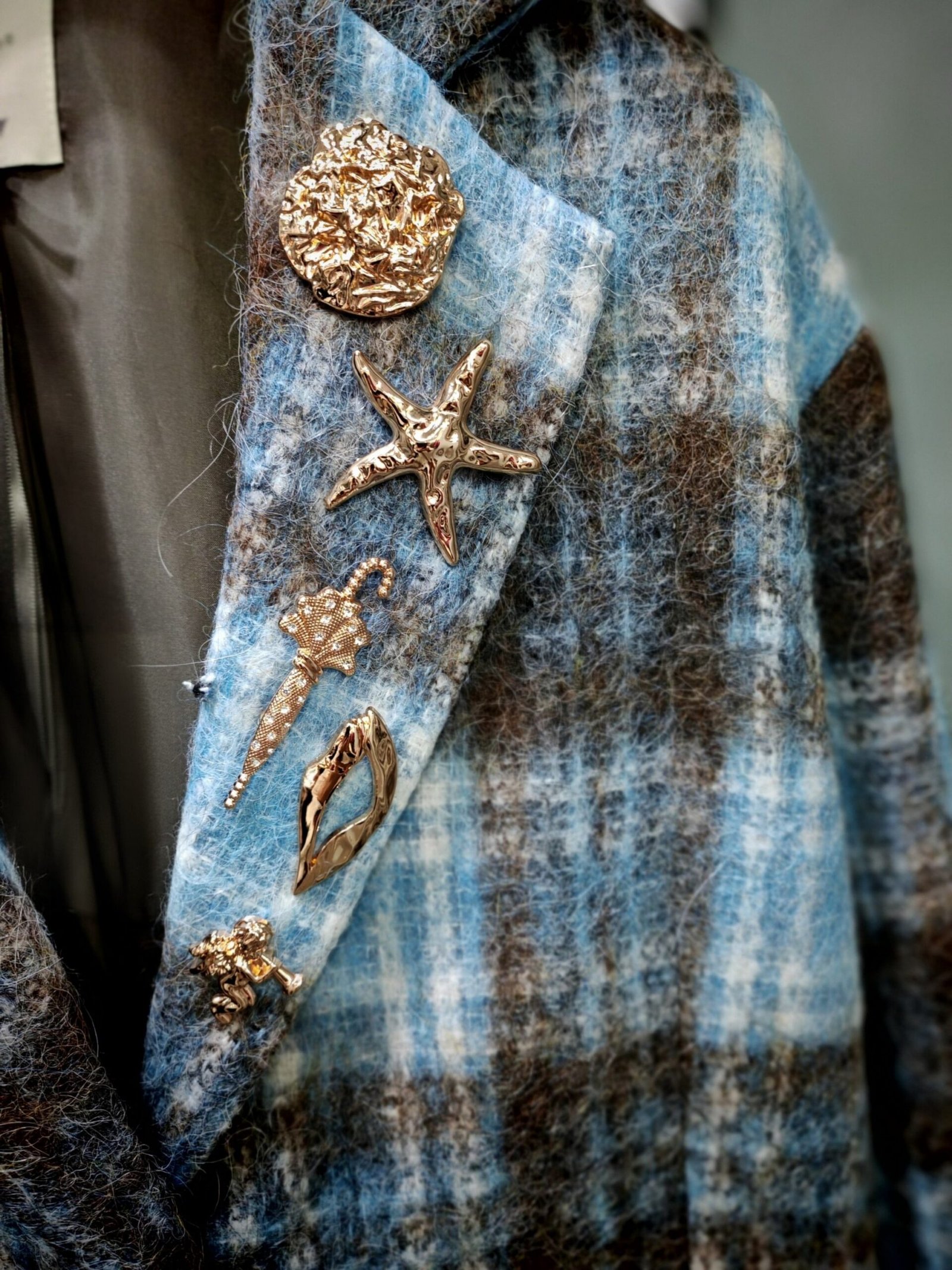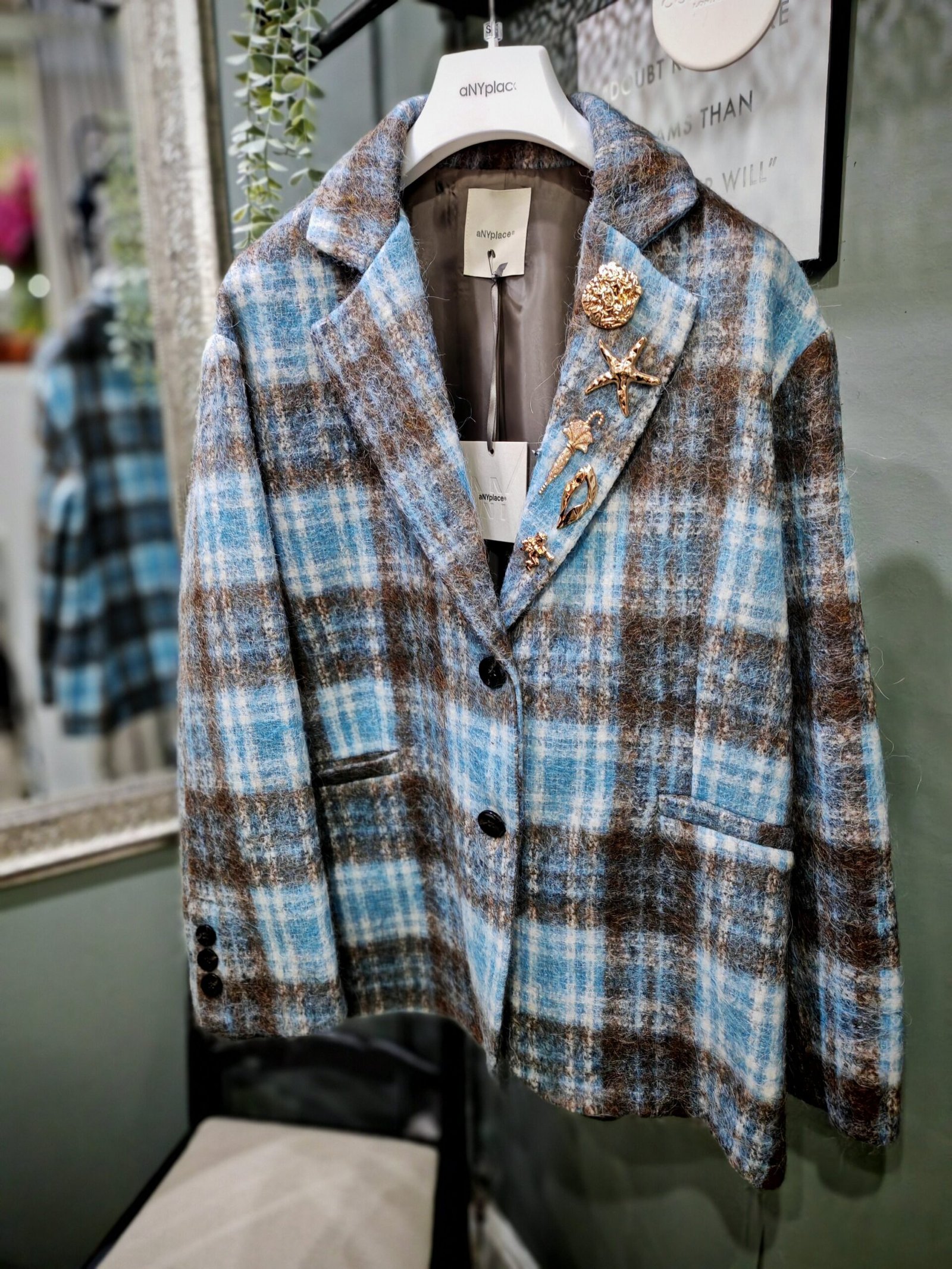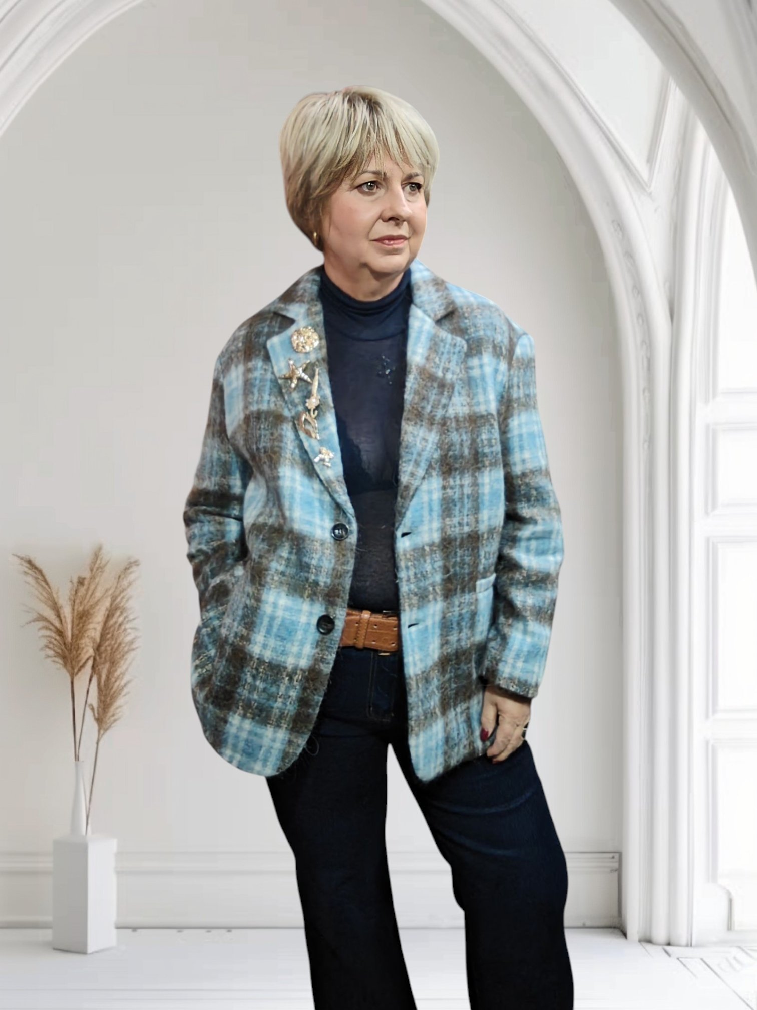 Fashionably oversized jacket in blue and brown plaid. Lapel, two buttons, three buttons on cuff. Two back vents and faux pockets. The stunning difference in this jacket is the fabulous removable brooches that come attached to the lapel.