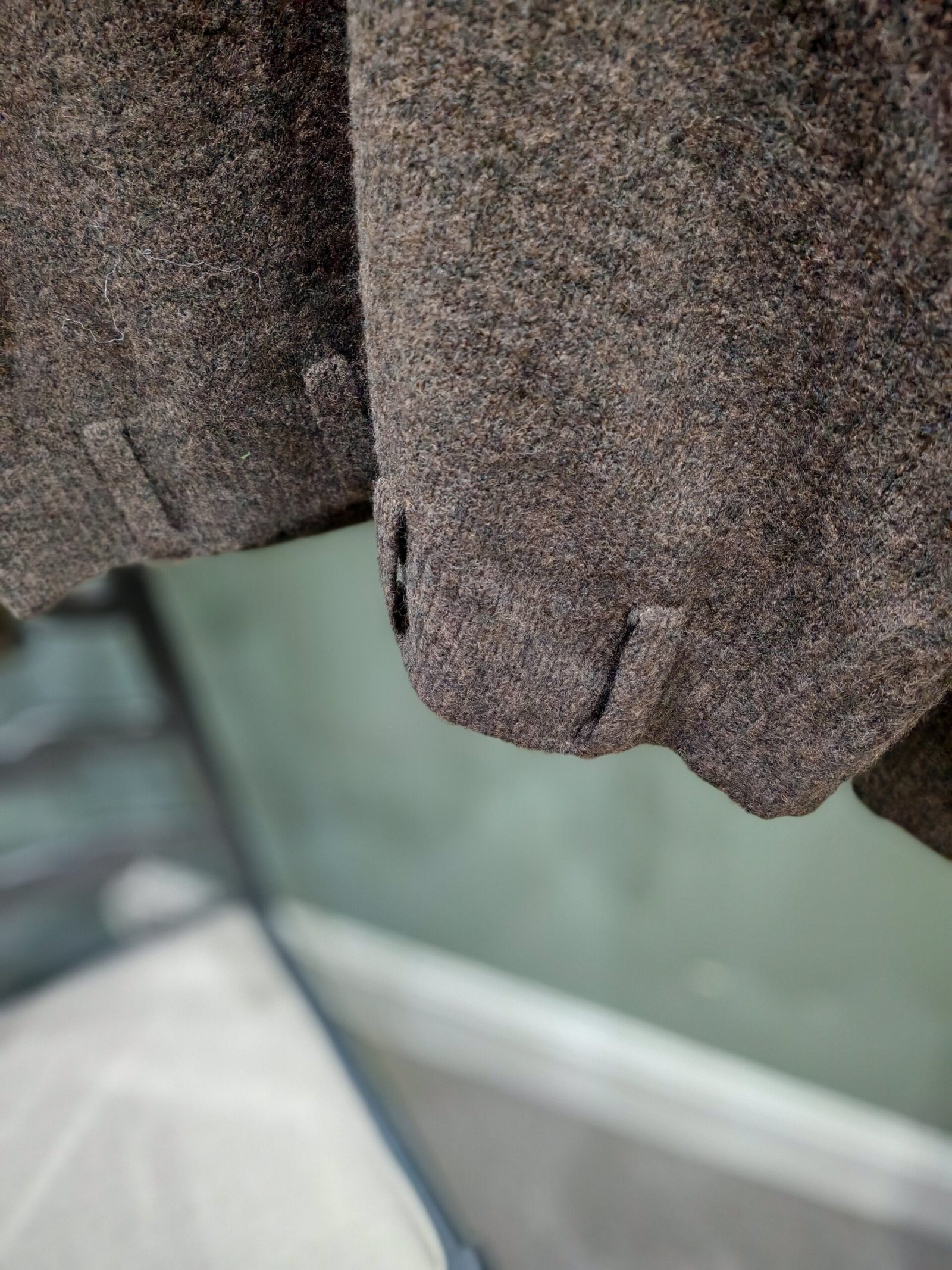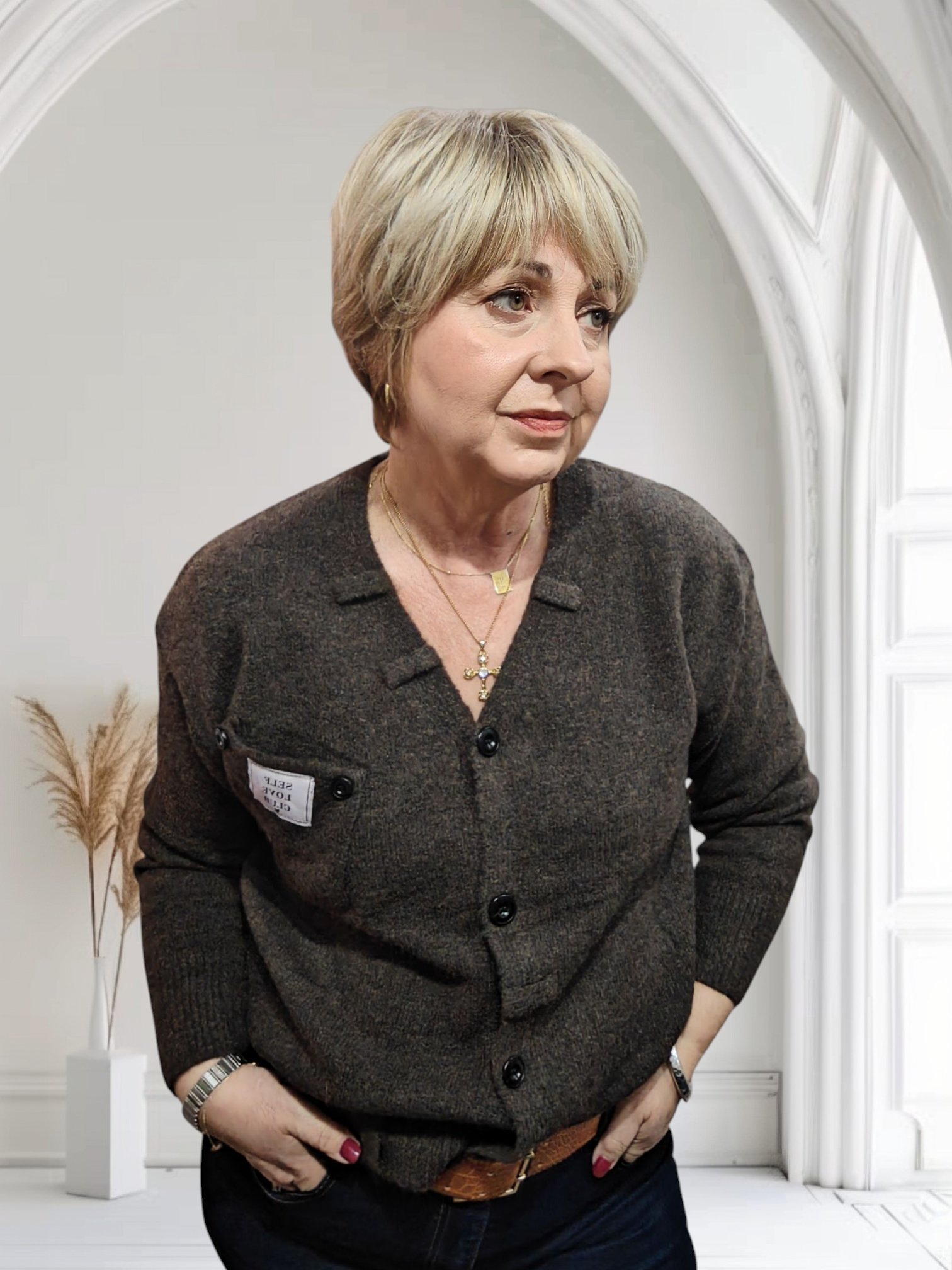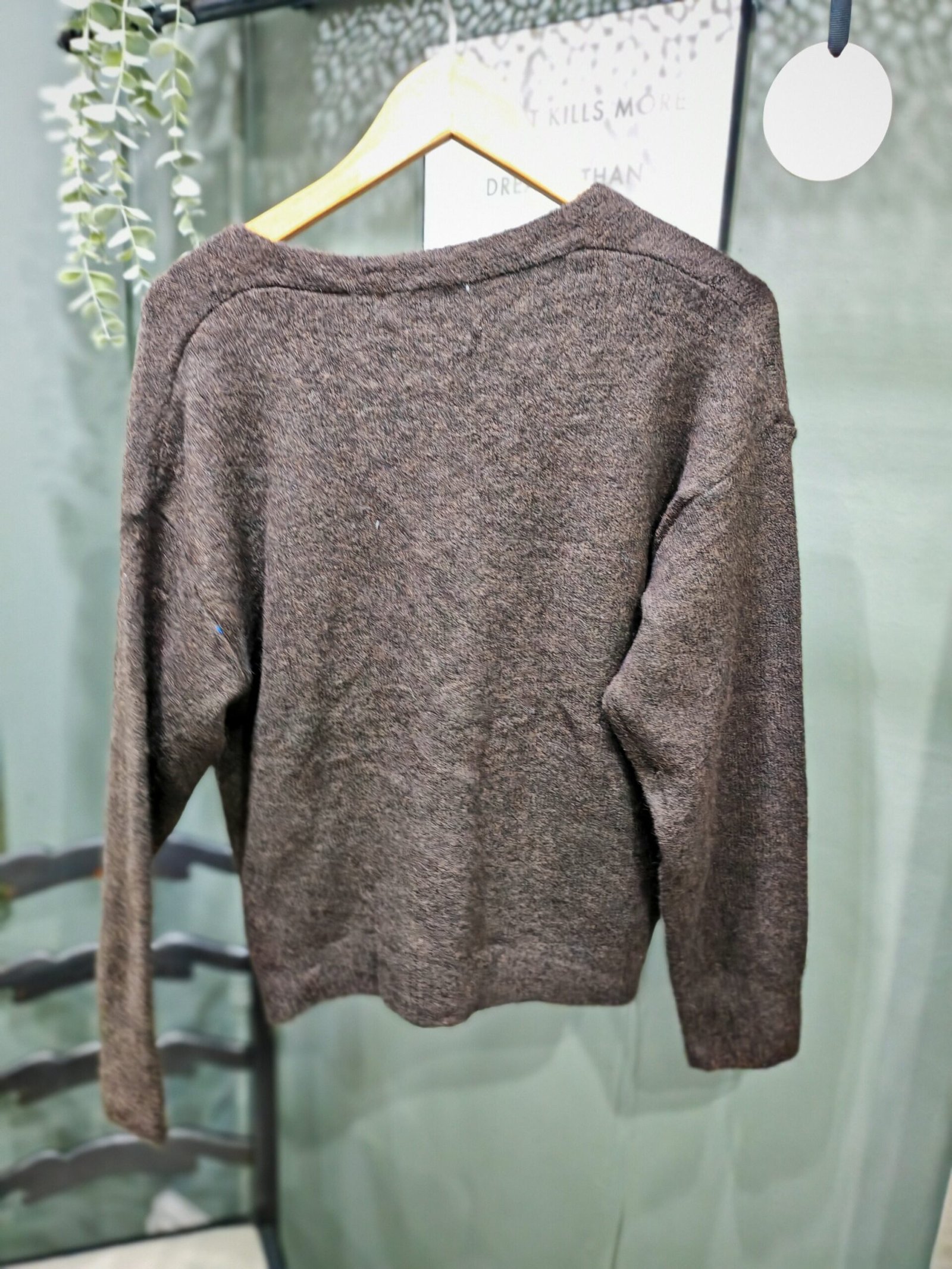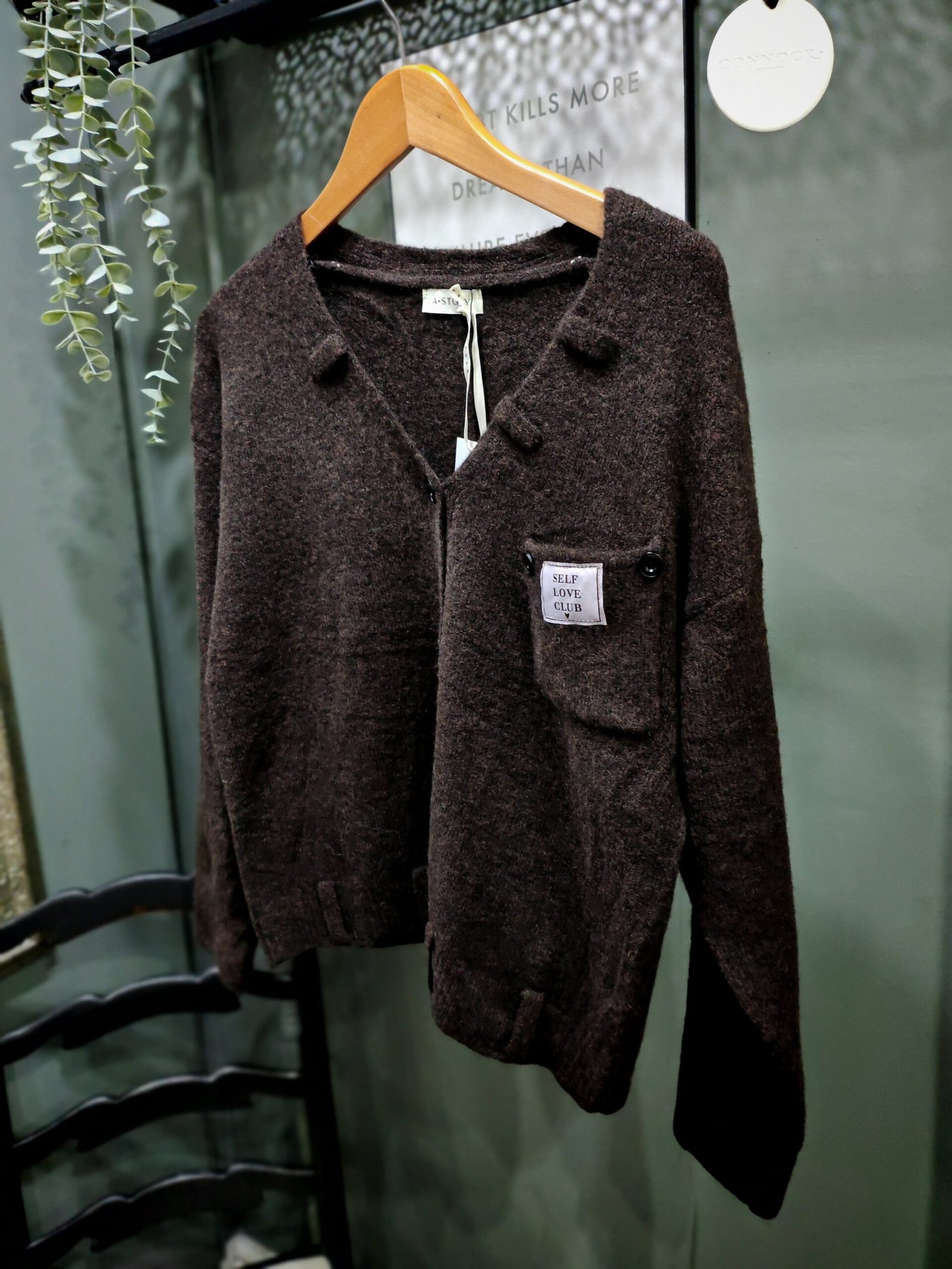 Stand out from the crowd in this season’s colour knit with a difference. Emblem and button on breast pocket. Loop detail around neck and bottom. Button through. V neck. Rib cuff.