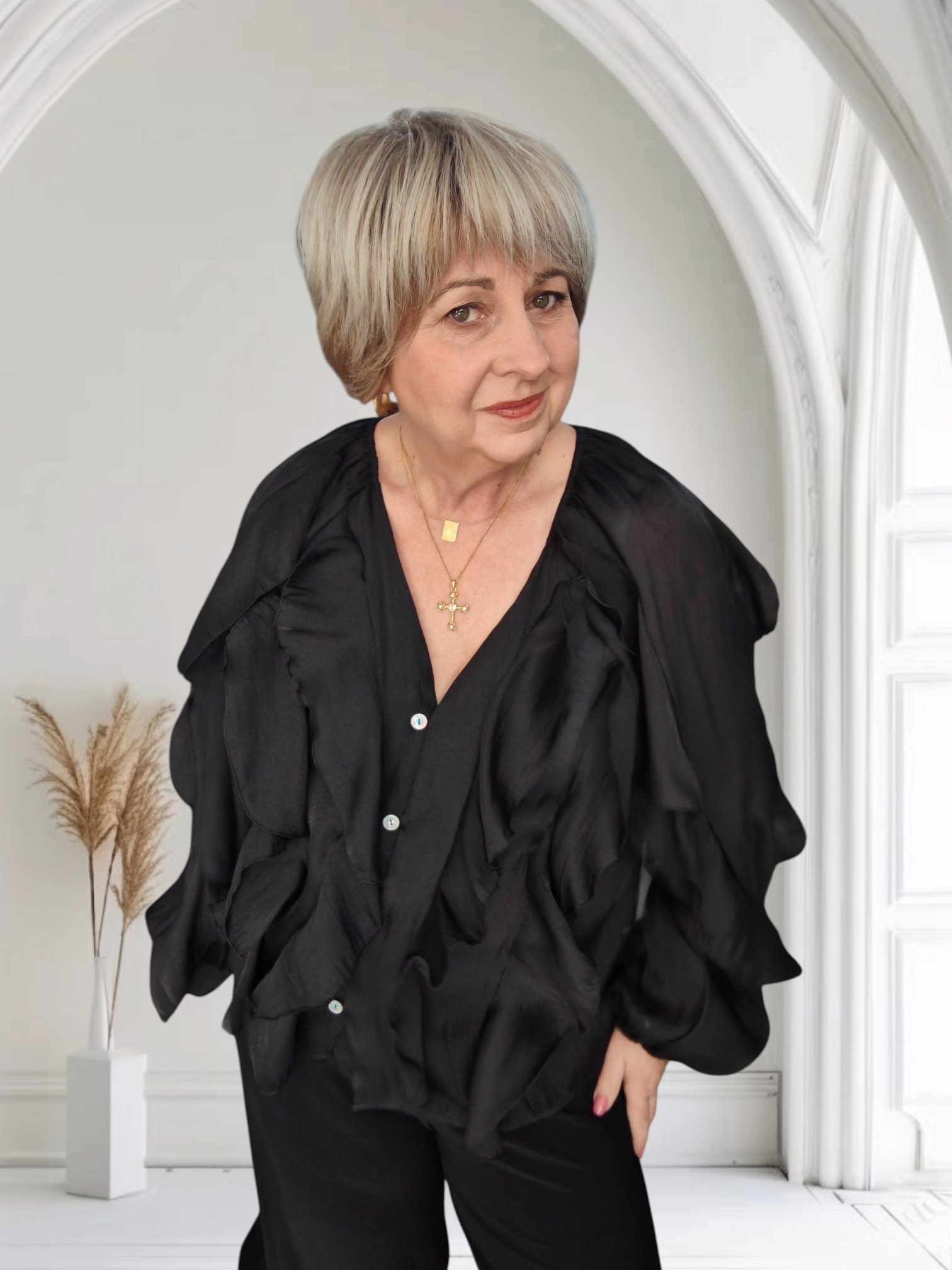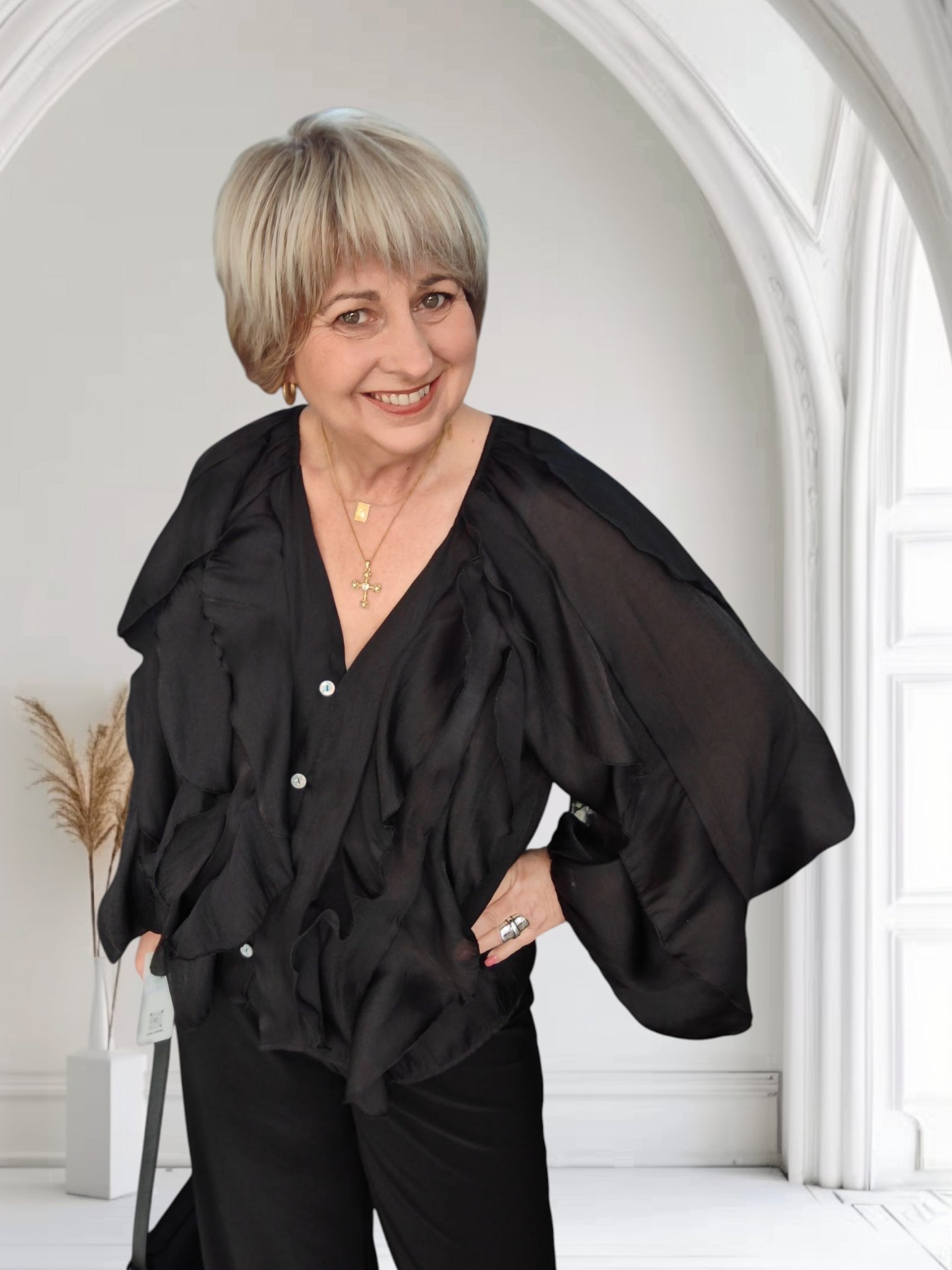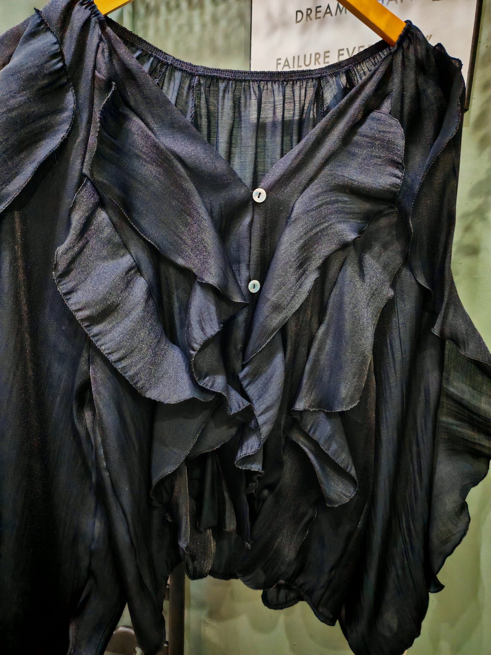 Fabulous frills on the front and sleeve of this button through, v neck blouse. Perfect for party season!