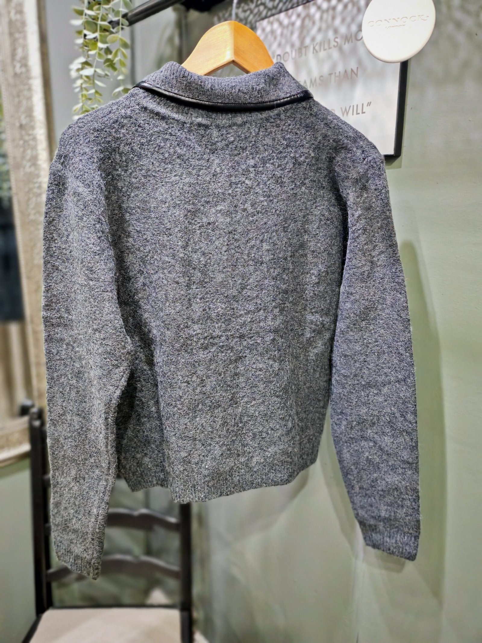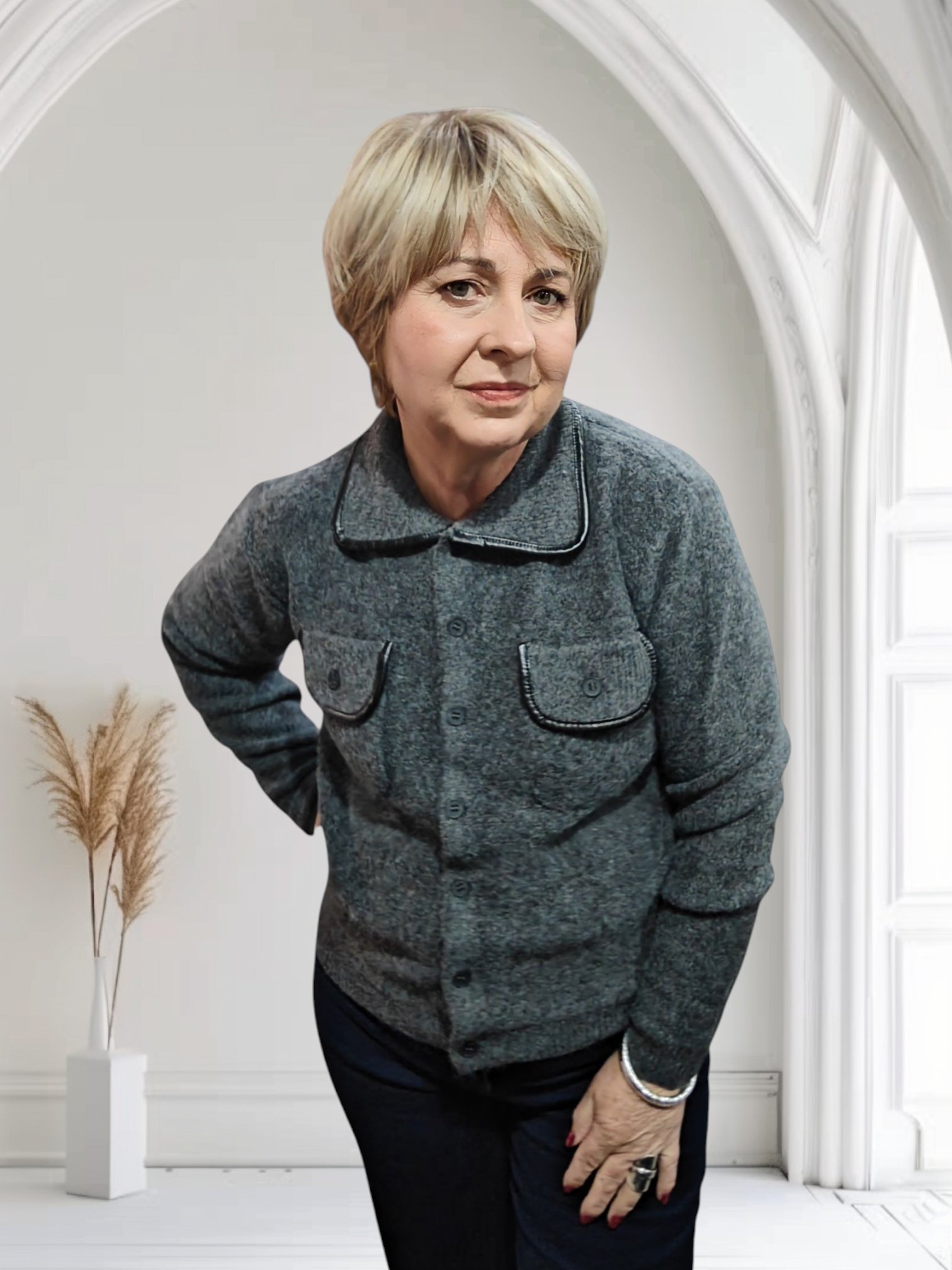 Gorgeous grey button through knit with faux leather piping on collar and pockets. Round collar and two from pockets with buttons. Rib sleeve.