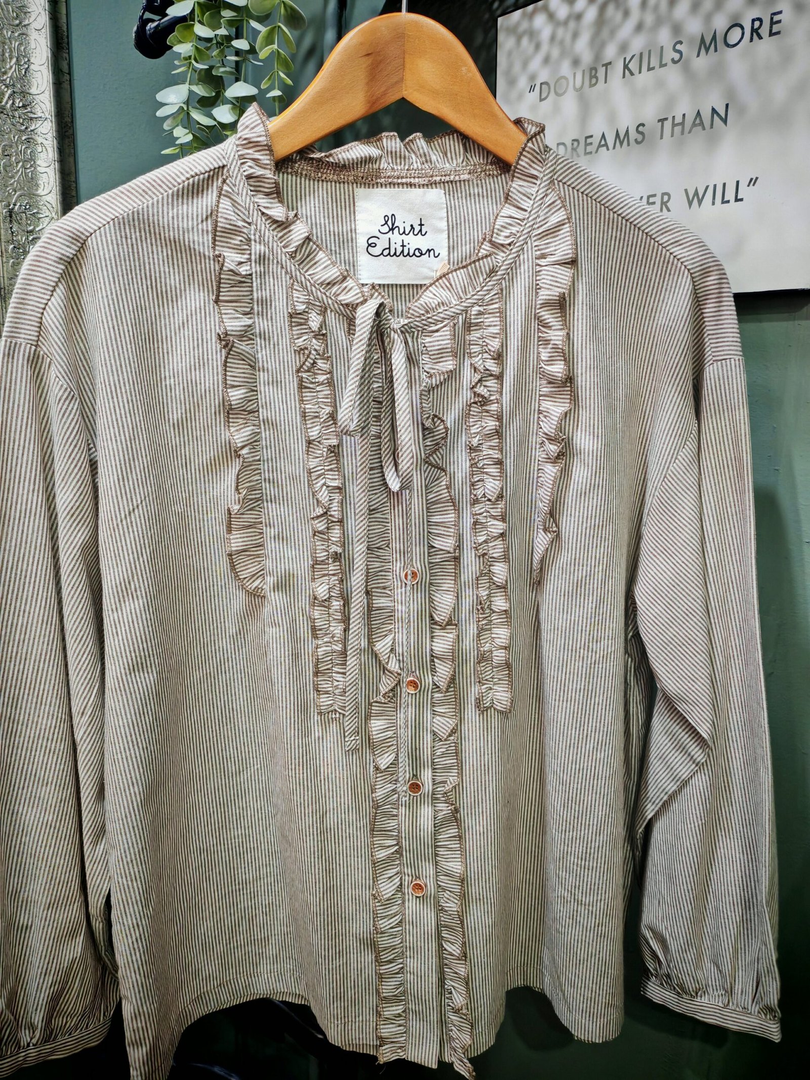 This brown pinstripe ruffle blouse has a tie neck so you can wear it open as a v neck, or tie the tie for a more dressed up look! Narrow button cuff.